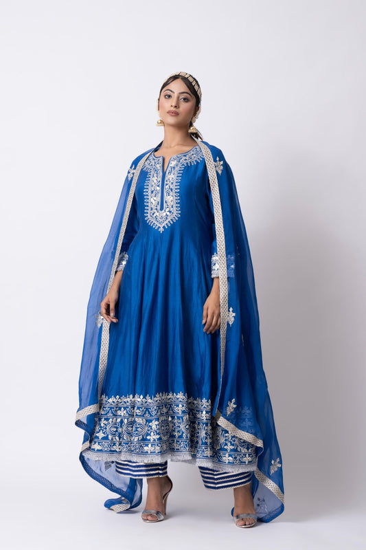 Cobalt Blue Nakshi Embellished Anarkali Kurta With Palazzo And Dupatta (Set of 3)
