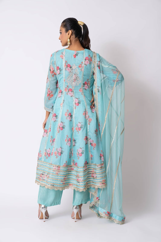 Firozi Blue Silk Chanderi Hand Block Printed Anarkali Set