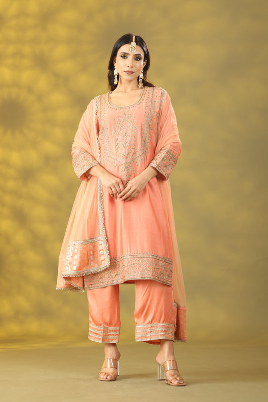 Peach Kurta with Pant and Net Dupatta