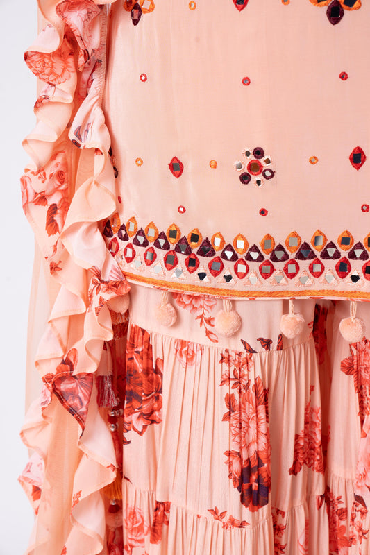 Peach Gharara set with mirrorwork on the kurta with printed gharara and an organza dupatta.