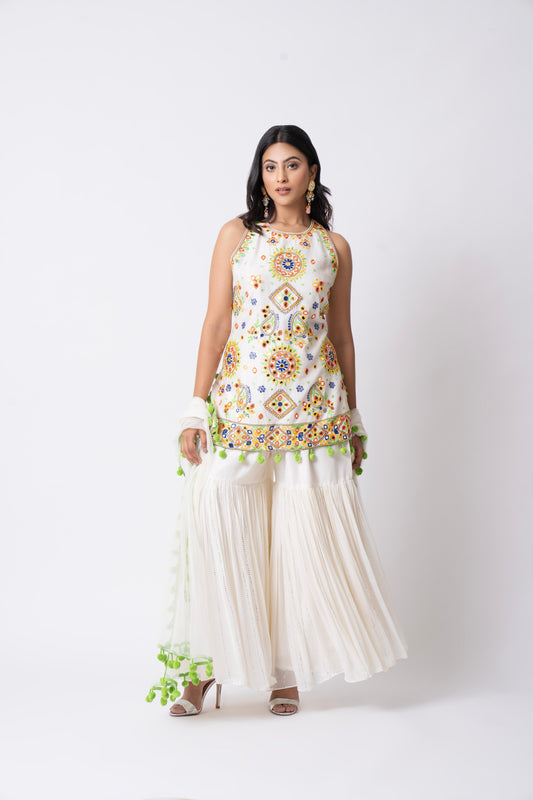 White Gharara set with mirrorwork embellisment on the kurta and plain gharara with an organza dupatta with pompoms.
