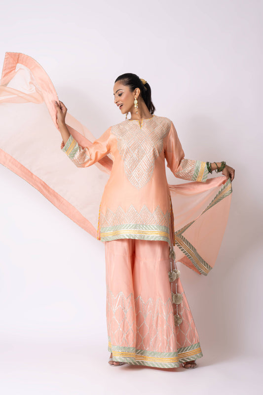 Peach Katan Silk Gota Embroidered Gharara Set