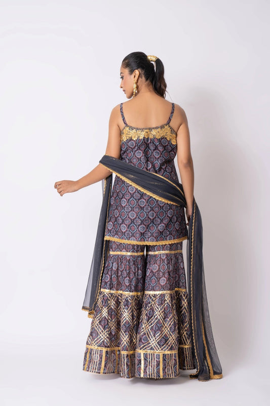 Blue Chanderi Ajrakh Printed Gharara Set
