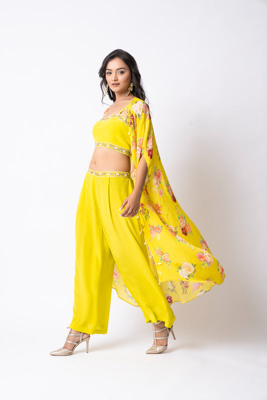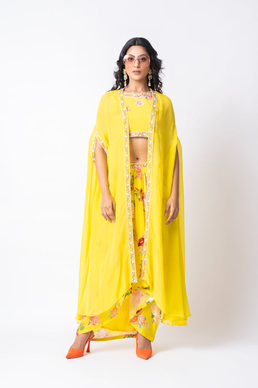 Yellow cape set with embellishment on the cape, blouse and a plain palazzo pants.