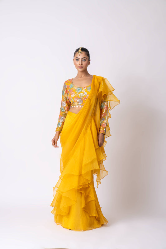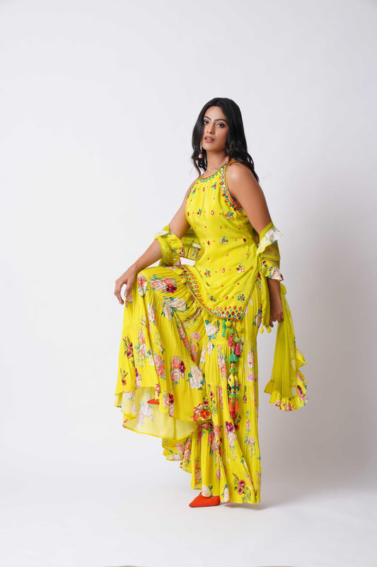 Yellow Gharara set with mirrorwork done on the kurta and printed gharara with an organza dupatta with ruffles.