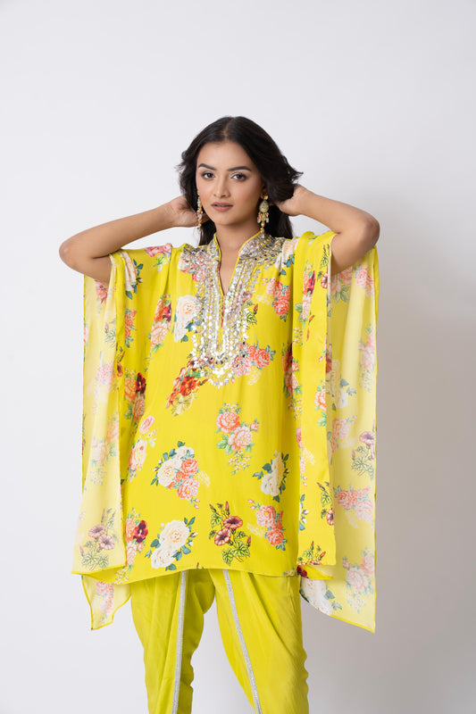 Yellow cape set with embellishment on the cape and the blouse along with a printed dhoti.