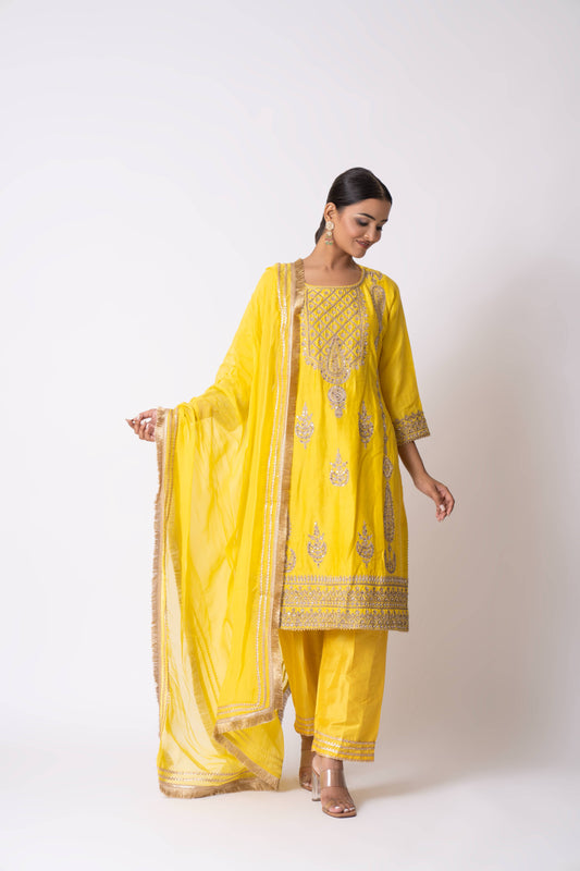 Yellow Nakshi Gota Embellished Kurta With Gota Pati Gharara and Dupatta (Set of 3)