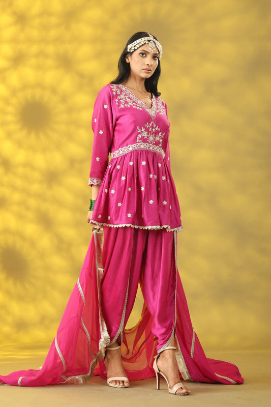Cerise Pink Short Anarkali with Dhoti Pant and Dupatta