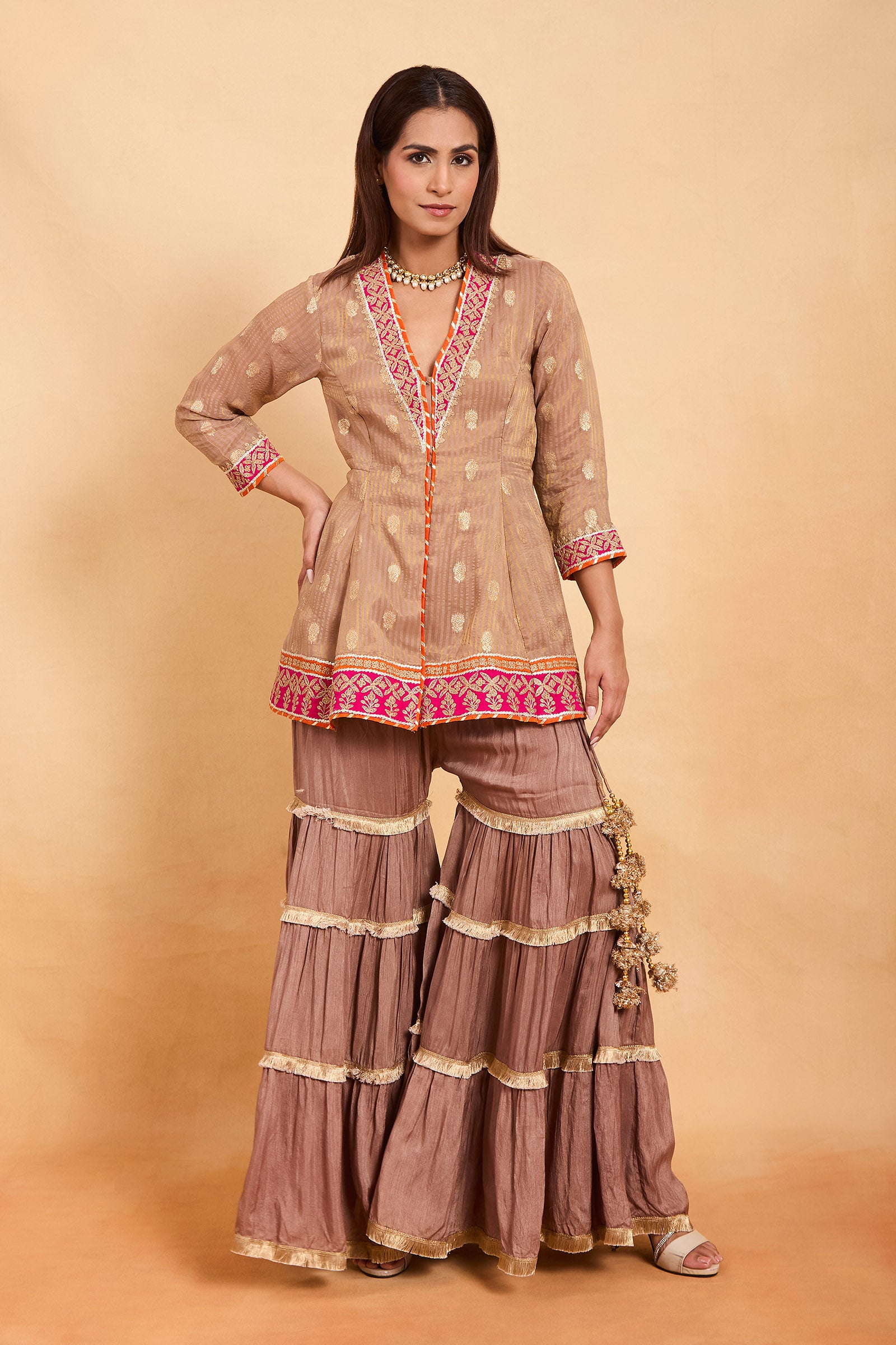 Discover effortless elegance. The short kurti, in a sophisticated beige silk blend, features a woven gold buti pattern and bold Rani Pink embroidery. The look is completed by the wide-flared, tiered gharara in warm brown tones and a vibrant Fuchsia Dupatta with gold Gota work. A comfortable yet glamorous choice for day or night festivities.
