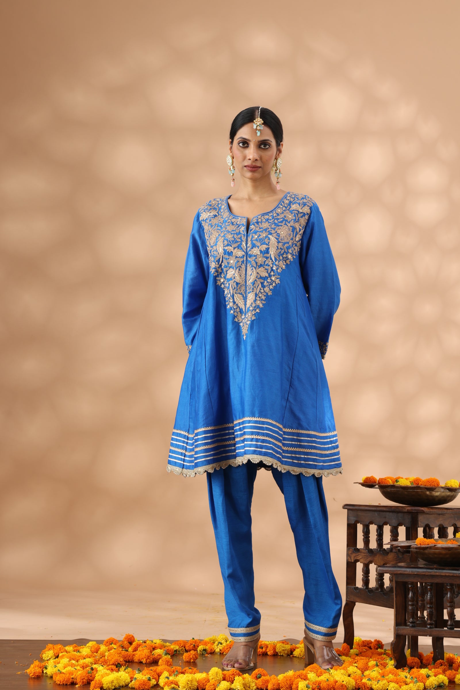 This REHNUMA ensemble features a banarsi chanderi kalidar kurta with intricate Kasab embroidery and hand sequence, paired with dola silk salwar for a luxurious feel. The Mid Blue is complemented by a light organza dupatta, making it perfect for festive occasions. finished with gota work.