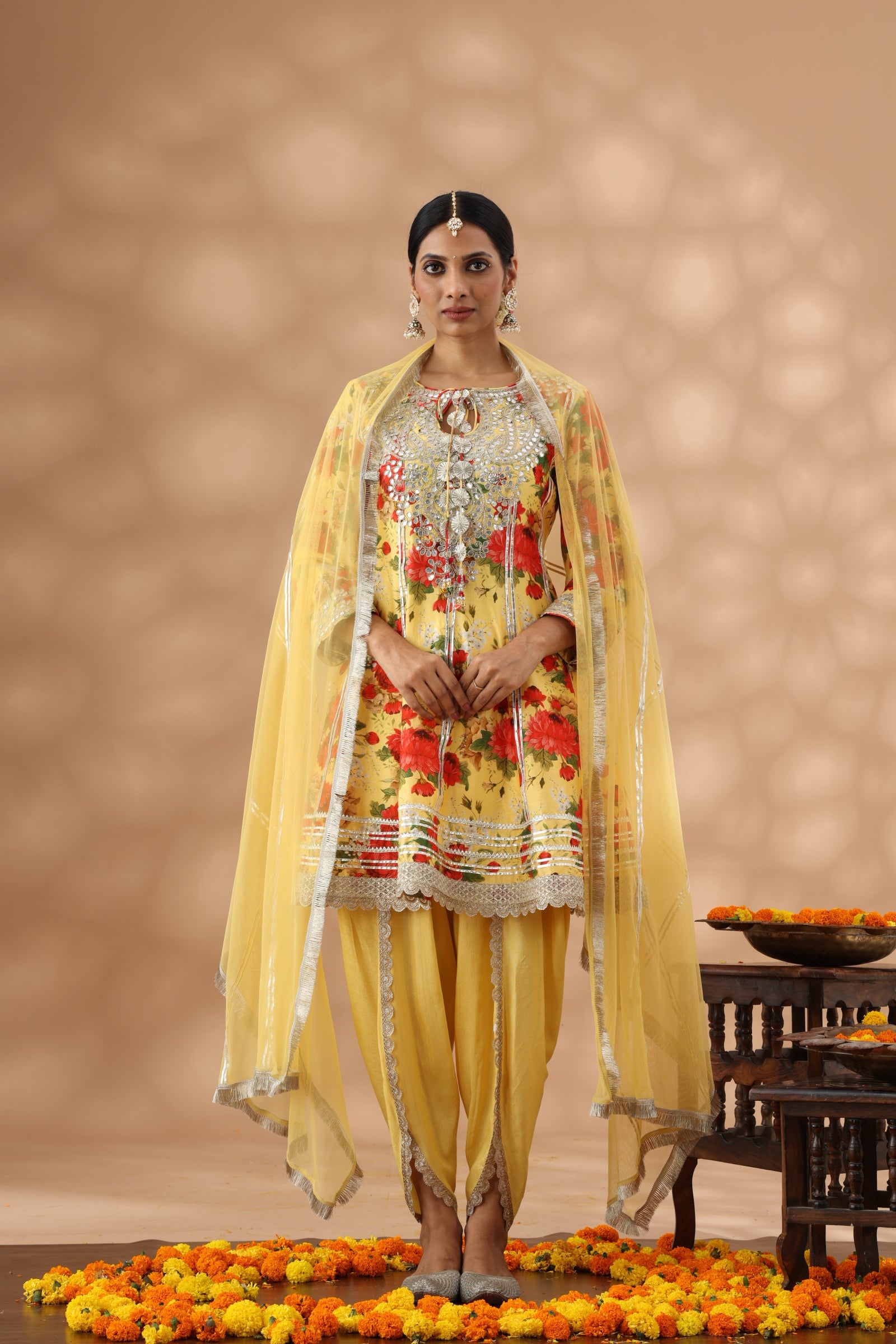 This ensemble features a cotton printed short anarkali with intricate Kasab embroidery, paired with dola silk dhoti for a luxurious feel. The light mustard is complemented by a light net dupatta, making it perfect for festive occasions. finished with gota work.
