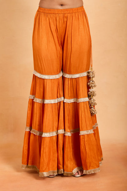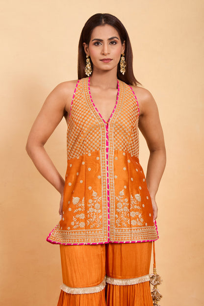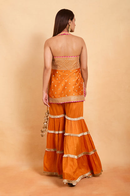 Twirl into any event in this show-stopping three-piece set. Features a chic halter-neck peplum kurti with dazzling Gold Zari work. Paired with a dramatic tiered ruffle Gharara that moves beautifully. Modern cut, traditional flair.