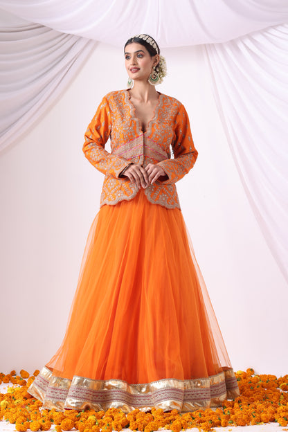 This striking ensemble features a butterfly net skirt paired with a pure raw silk jacket, adorned with intricate embroidery. The deep neckline and scalloped edges add a bold yet elegant touch.