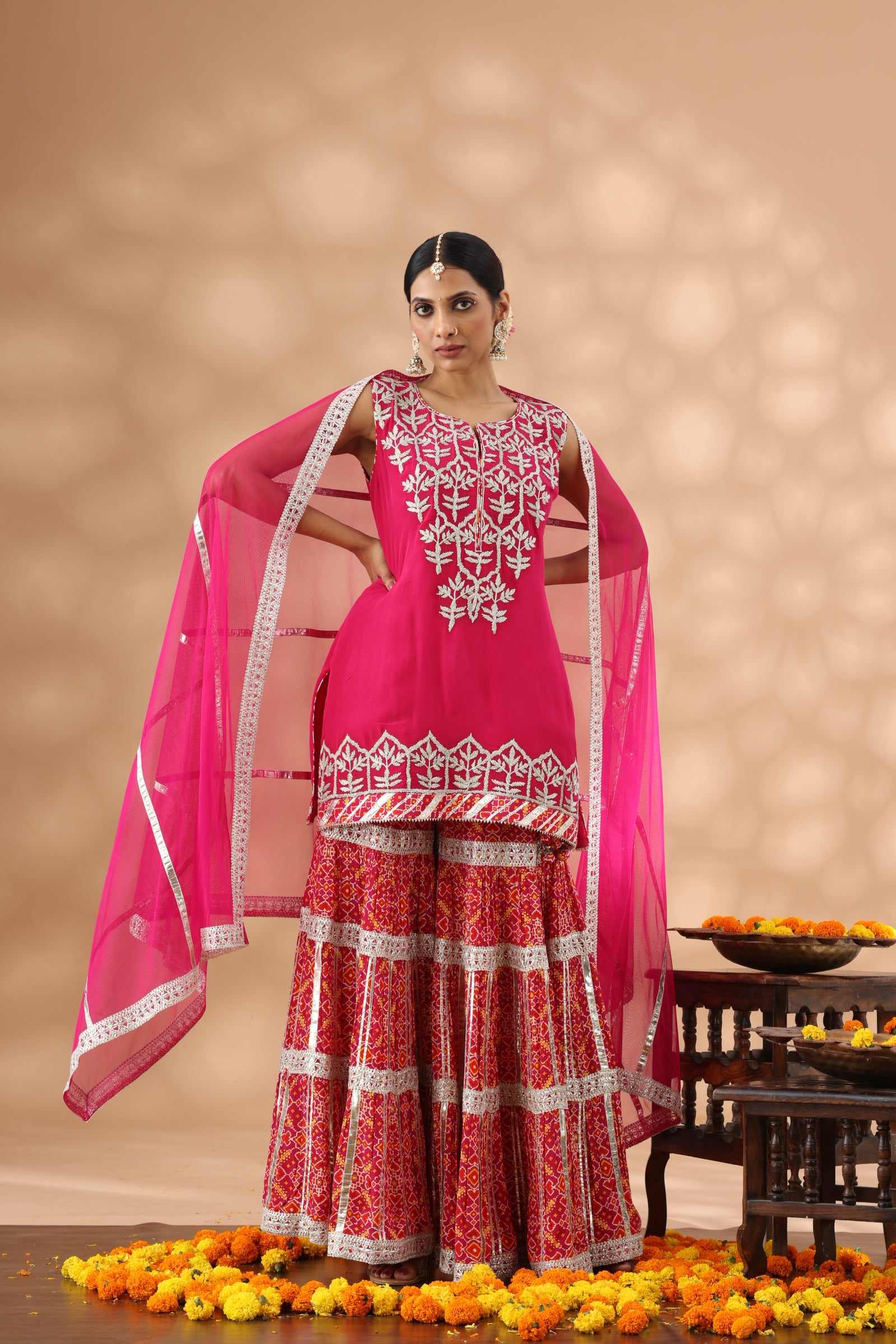 This ensemble features a crape kurta with intricate Kasab embroidery, paired with printed gharara for a luxurious feel. The peach is complemented by light net dupatta, making it perfect for festive occasions. finished with gota work.