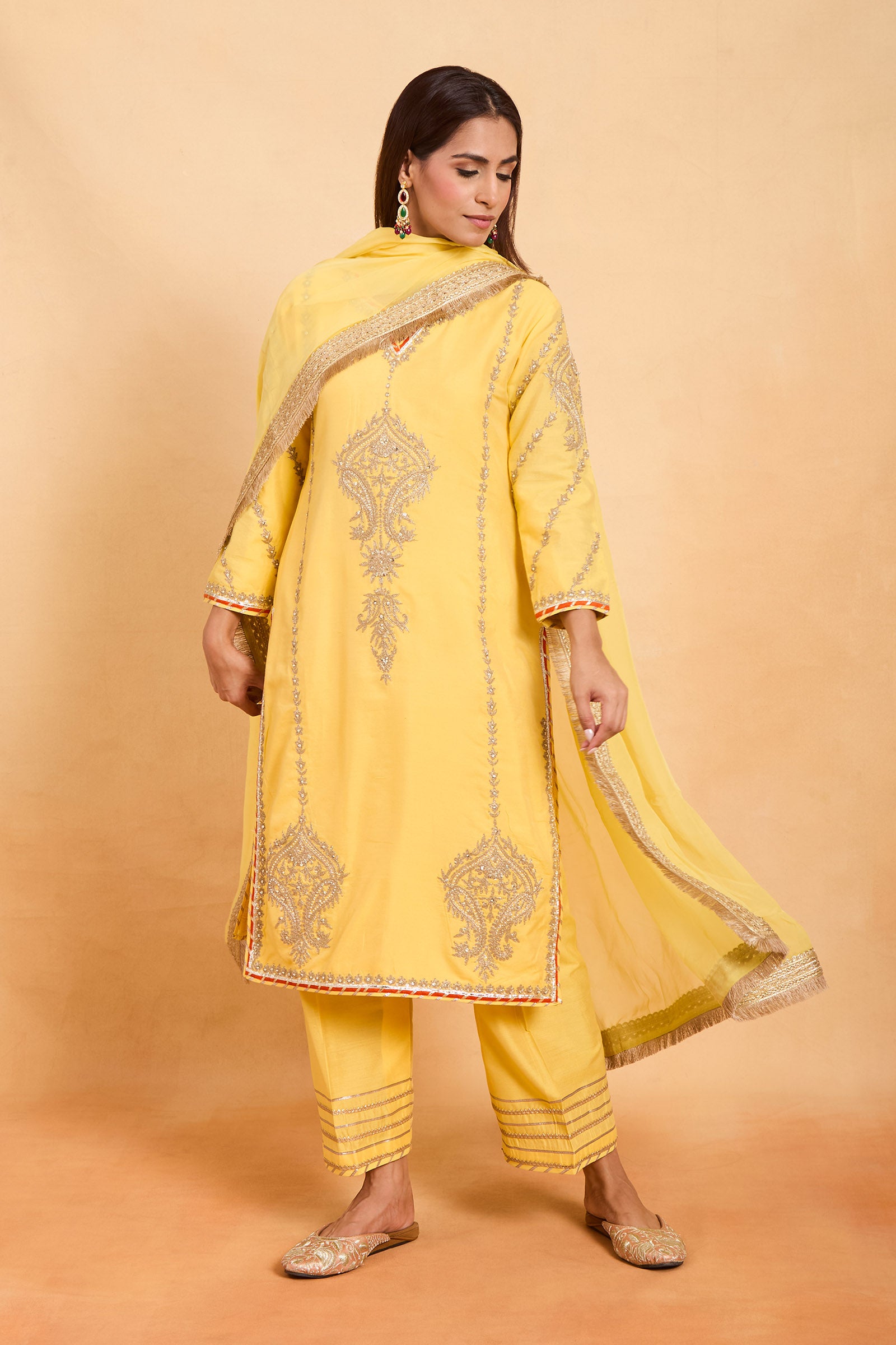 Sunshine Yellow Zari Embroidered Straight Cut Suit Set